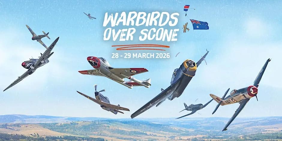 Mar 28-29 Sat-Sun: Warbirds Over Scone 2026 at Scone Airport in NSW, featuring an impressive lineup of historic aircraft and exciting aerial displays.